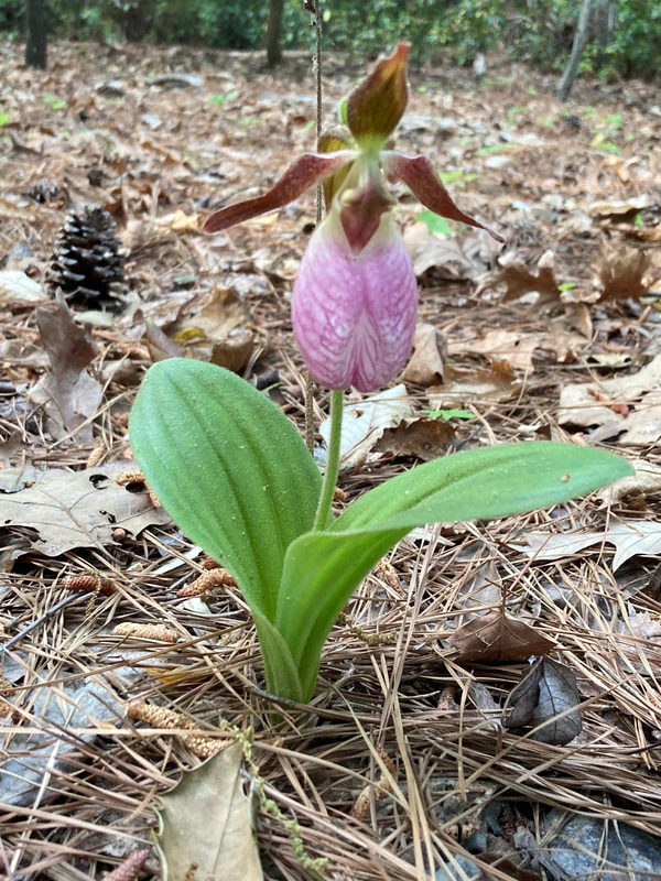 The lady slipper was another matter.  It turned out this little treasure enjoys a different environment, drier and higher in elevation than the Showy Orchis and among pine tree clearings and poking up from the pine needle bed.  You would think that a lavender slipper shaped flower in a clearing would be easy to spot.  But, these flowers on this trail are loners for the most part.  We found two but they were about ten feet apart.