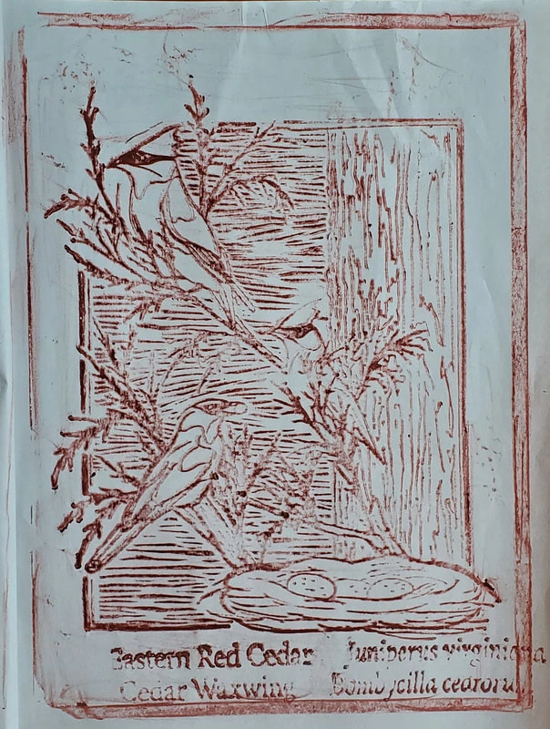The project began with me creating a series of ink drawings to be the base for each plaque.  These drawings each included a pairing of local plants and animals determined by our client.  A few examples of the original drawings you can see below.  These drawings were then scanned into the computer and "chatter" was added in order to create a carved woodblock print effect.  Perry, my husband and I, studied many, many examples of master woodblock prints as well as some of my own woodblocks in order to capture just the right texture.  The idea was that the plaques were not just art to be looked at, but to be interacted with so that children would be able to better learn about the plants and animals around them.