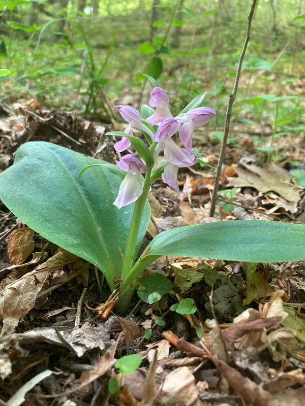 We were rewarded quickly with the side of the heavily wooded path early on our walk being dotted here and there with Showy Orchis in various stages of development and bloom.  These shy little flowers are fond of hiding under the undergrowth.  However, once my eye was train to look for the tiny flash of soft violet with bright white amid smooth fresh green broad leaves, they were fairly easy to spot.